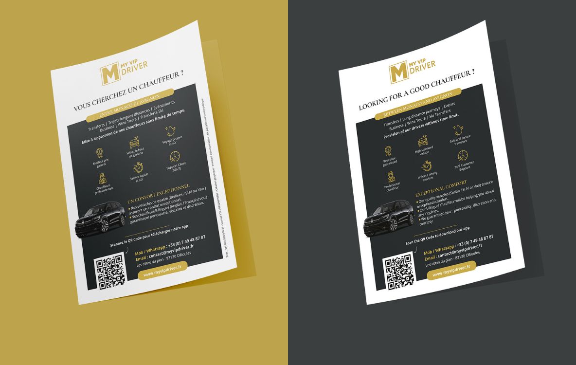 Nous avons eu le plaisir de concevoir un flyer sur-mesure pour My VIP Driver, service haut de gamme de mise à disposition de chauffeurs privés entre Avignon et Monaco.