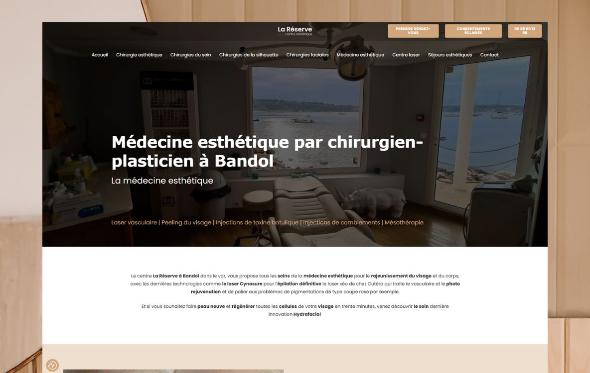 Nous avons eu le plaisir d’accompagner La Réserve, une clinique de chirurgie esthétique située à Bandol, dans la conception de son nouveau site internet vitrine. Ce projet avait pour ambition de créer un espace digital à la fois élégant, informatif et rassurant, en parfaite cohérence avec l’image haut de gamme et la qualité des services proposés par l’établissement.