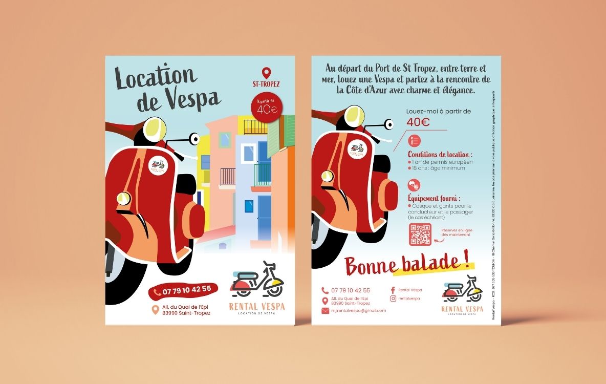 Nous sommes ravis de dévoiler notre dernière création : le logo et le flyer colorés de Vespa Rental, une marque dédiée à la location de Vespa, au cœur de St Tropez.