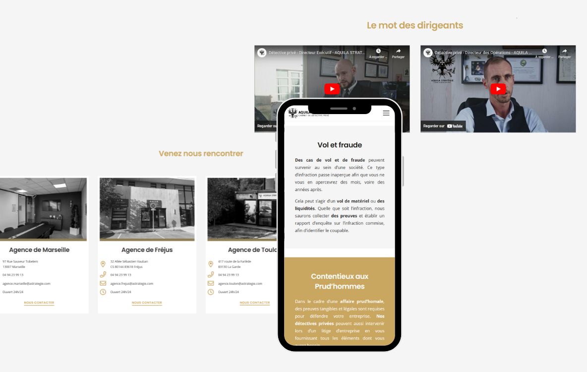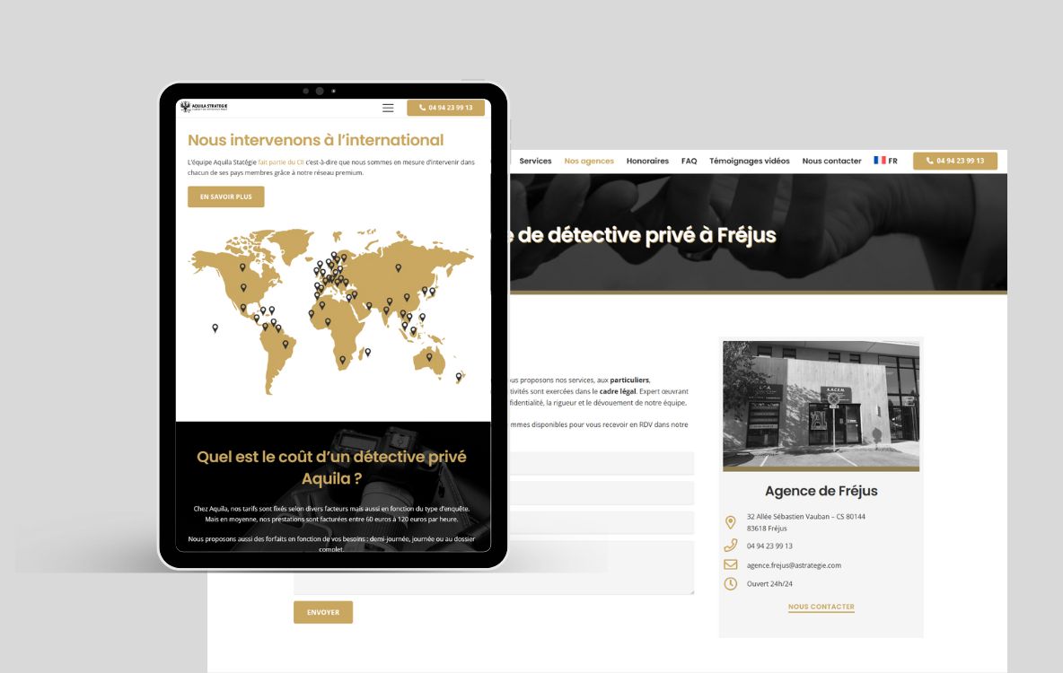 Aquila Stratégie regroupant plusieurs sites sur le littoral de la Provence et de la Côte d’azur, nous avons créé une page pour chaque agence de détectives privés : Marseille, Toulon, La Garde, Hyères, Fréjus et Nice.