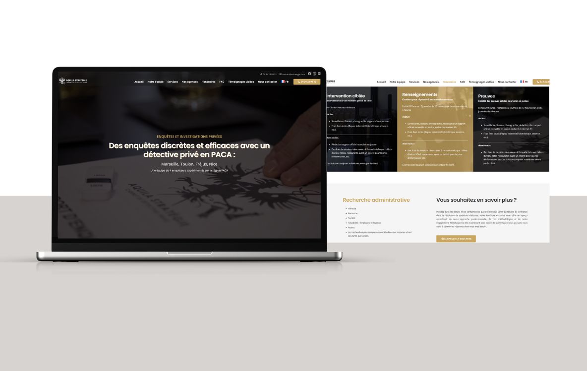 Interpaul est fière de vous présenter le site web réalisé pour Aquila Stratégie, un détective privé de Marseille à Nice, spécialisé dans la résolution d’enquêtes les plus complexes. Le design élégant, orné de tons dorés et noirs, plonge les visiteurs dans un univers de discrétion et de sérieux tout en les invitant à explorer les profondeurs des investigations du détective privé.