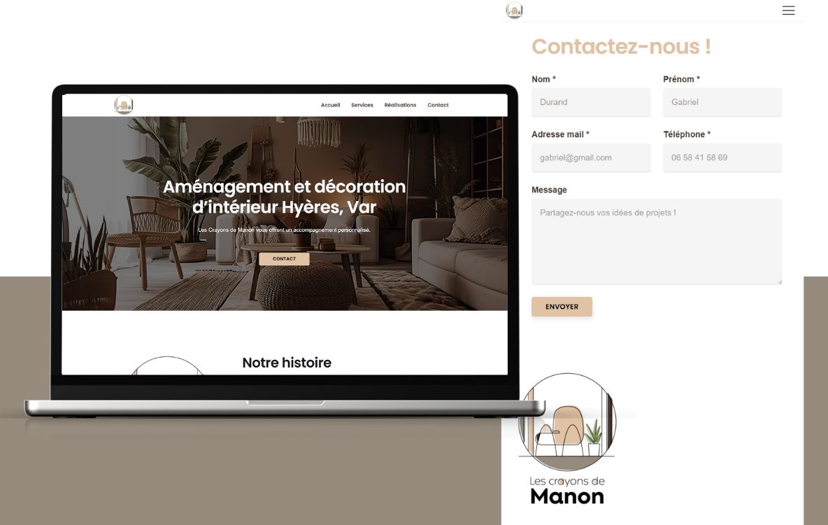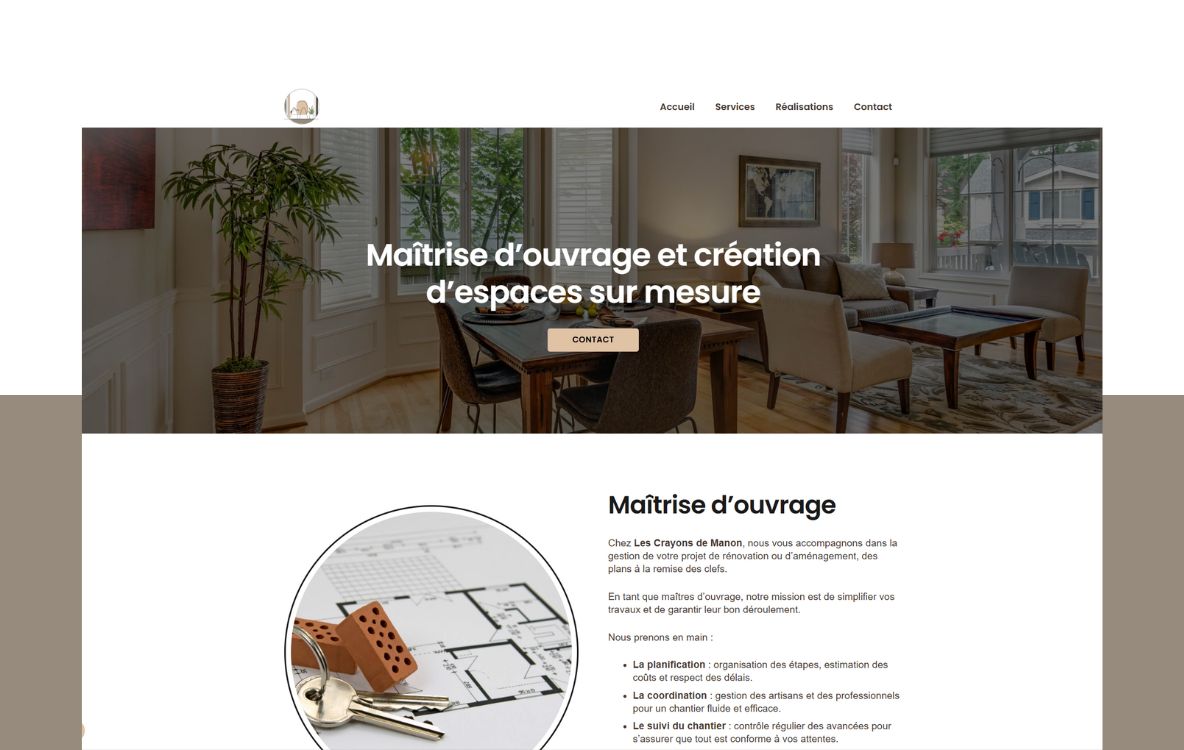 Nous avons eu le plaisir de concevoir le site vitrine des Crayons de Manon, une entreprise spécialisée dans l’aménagement et la décoration intérieure. Ce projet digital a été pensé pour refléter l’univers créatif et raffiné de l’entreprise tout en offrant une navigation fluide et intuitive.