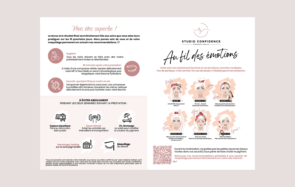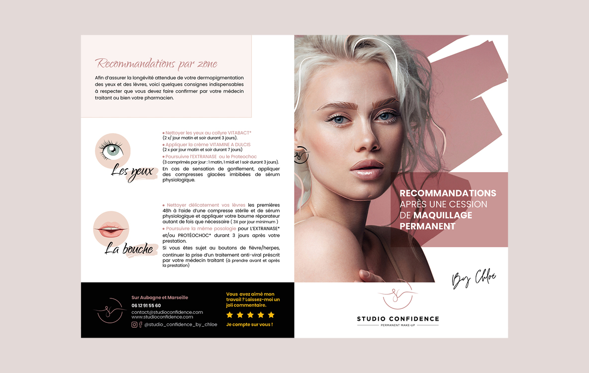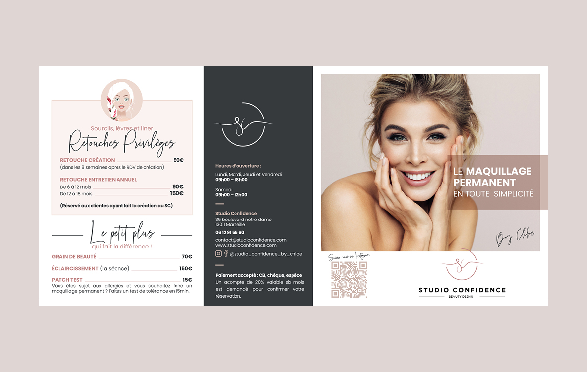 Notre agence est fière de présenter les deux dépliants coçues sur mesure pour le salon de maquillage permanent STUDIO CONFIDENCE à Marseille. Le premier dépliant 3 volets, 315x148mm, est une véritable vitrine de l’art de la beauté éternelle et offre aux clients potentiels un aperçu captivant des services uniques proposés par ce salon. Le second est un dépliant 2 volets qui met en avant les prestations avec délicatesses et propose des conseils et un véritable suivi.
