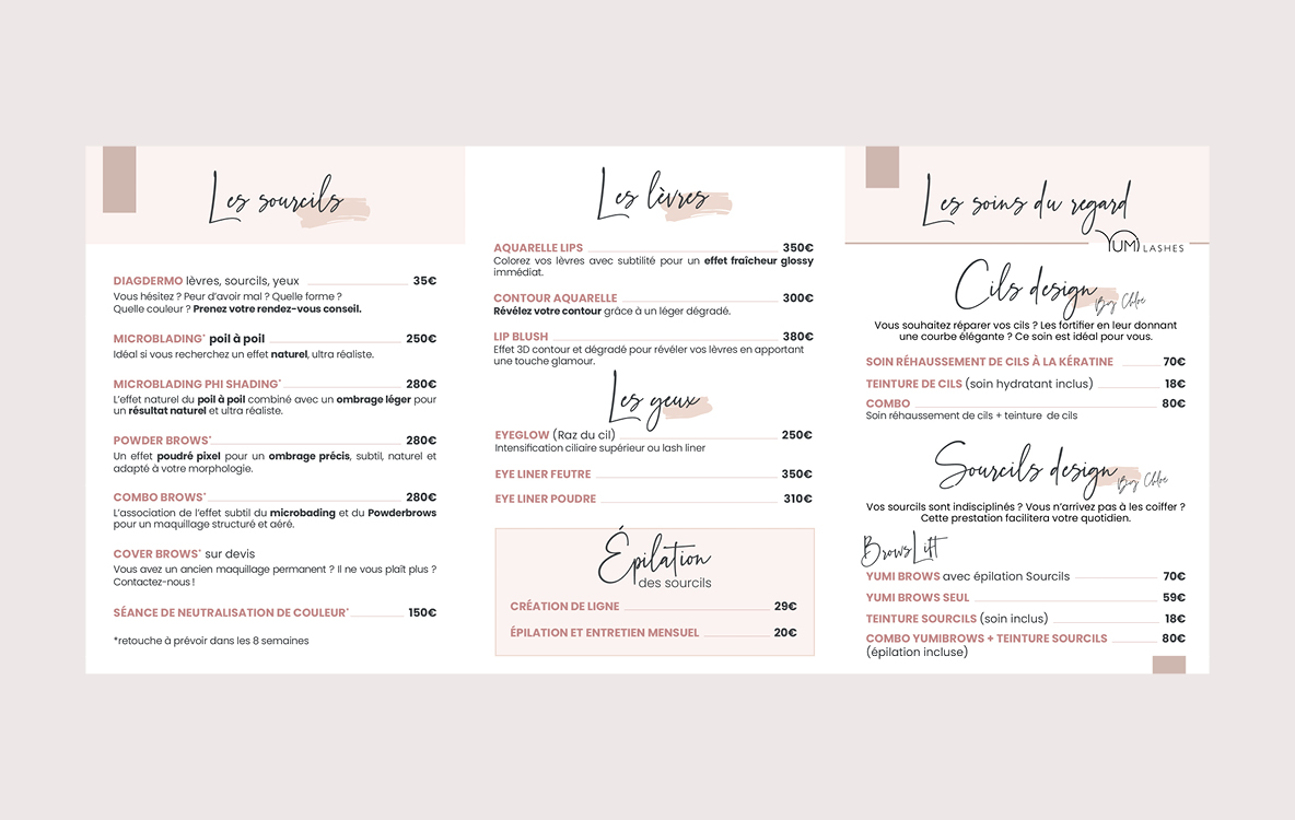 Chaque page du dépliant est conçue pour engager et captiver le lecteur. Il fournit des informations détaillées sur les services offerts, tels que le maquillage des sourcils, des lèvres et des yeux. Les descriptions claires et concises expliquent les avantages et les résultats attendus, rassurant ainsi les clients sur la qualité et la compétence des professionnels du salon.
