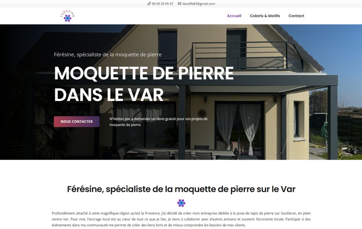 Nous avons eu le plaisir de concevoir le site internet de Férésine, spécialiste de la moquette de pierre dans le Var. Ce projet digital a été pensé pour valoriser un savoir-faire technique et esthétique, tout en rendant l’information claire et accessible.