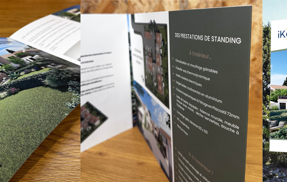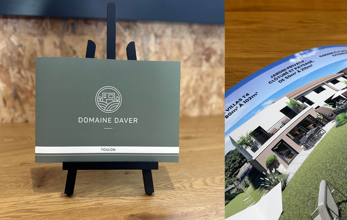 Notre agence de communication est fière de vous présenter cette magnifique plaquette 3 volets dédiée à un programme immobilier d’exception, le DOMAINE DAVER. Réalisée avec soin, elle allie l’élégance du pelliculage soft touch à des visuels à couper le souffle, mettant en valeur les prestations exclusives offertes par ce lieu d’exception.