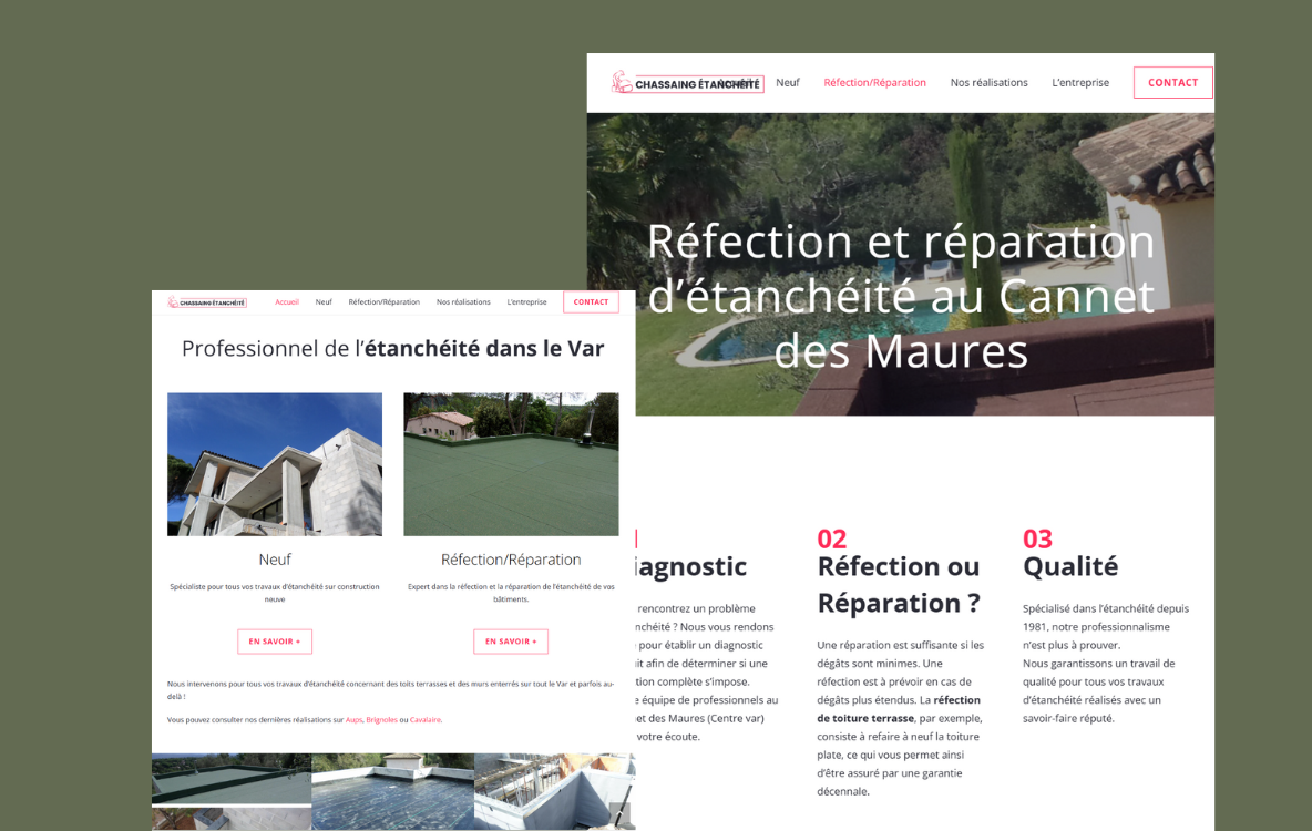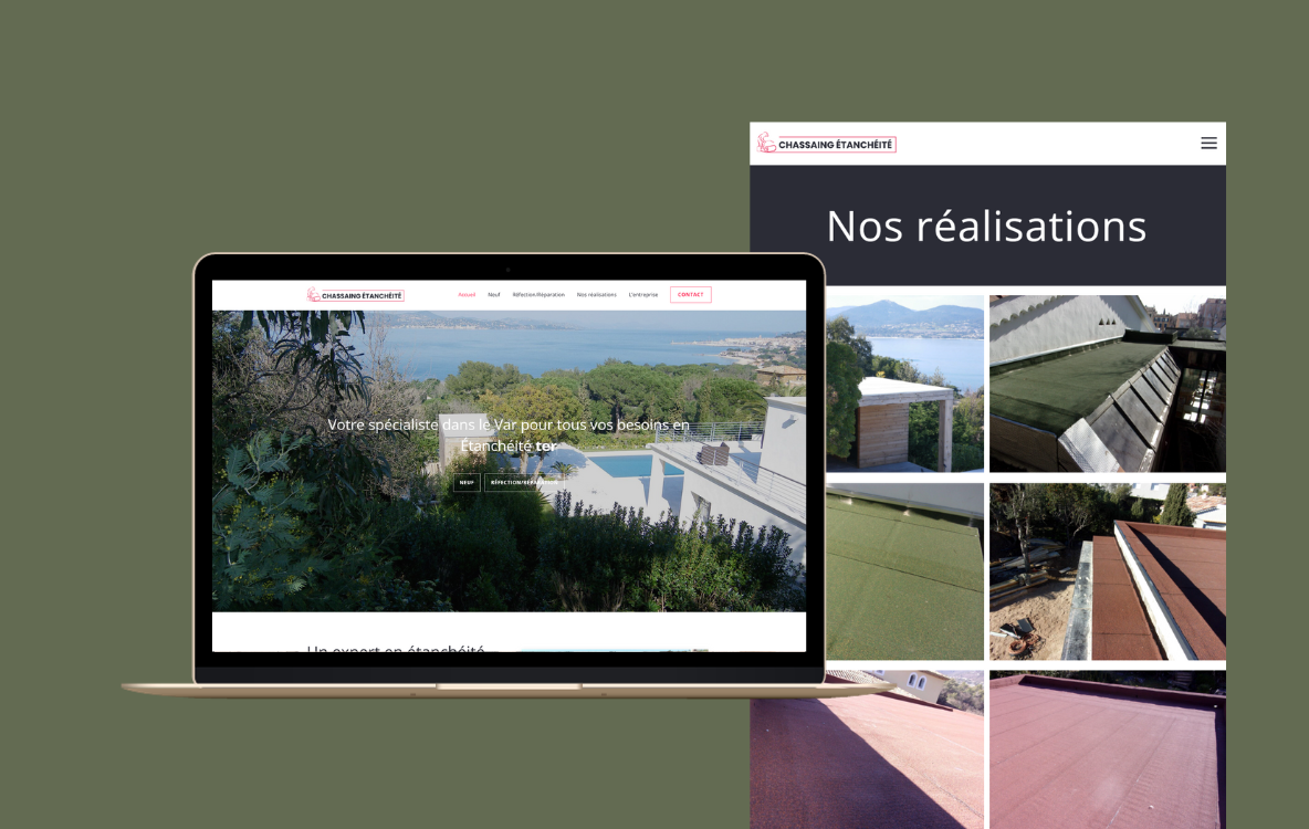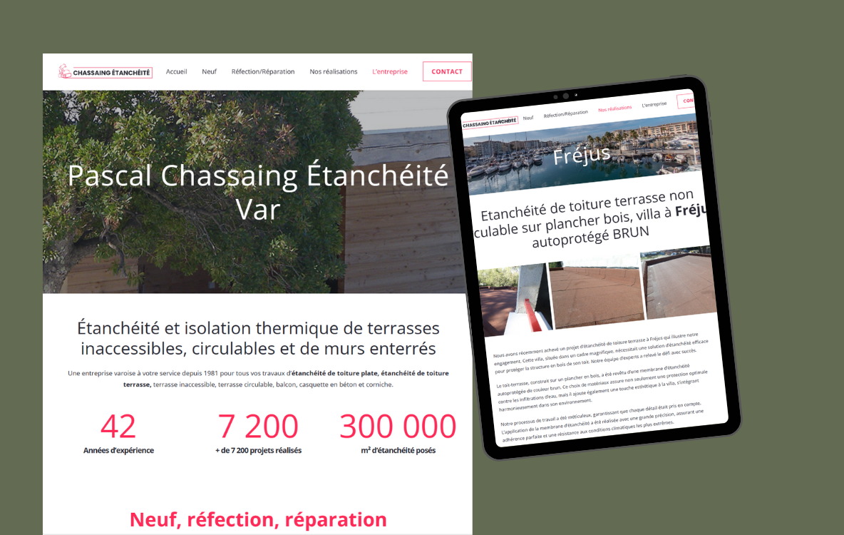 Nous sommes heureux de vous présenter notre collaboration avec CHASSAING ETANCHEITE, une entreprise spécialisée en étanchéité de toitures plates et de murs enterrés, basée au Cannet-des-Maures. Nous avons eu le privilège de travailler sur leur projet de site web qui devait refléter à la fois leur expertise technique et leur professionnalisme depuis plus de 40 ans, tout en ayant un design dans l’air du temps.