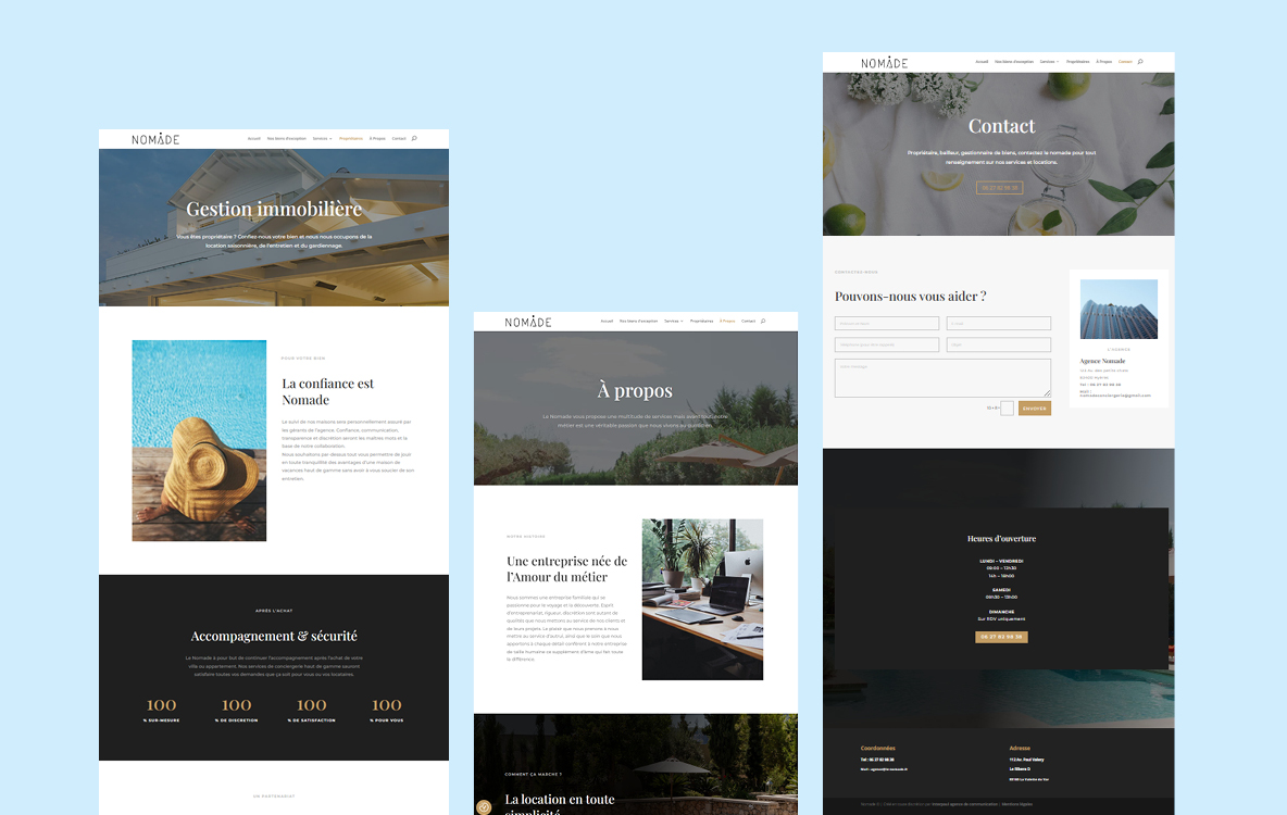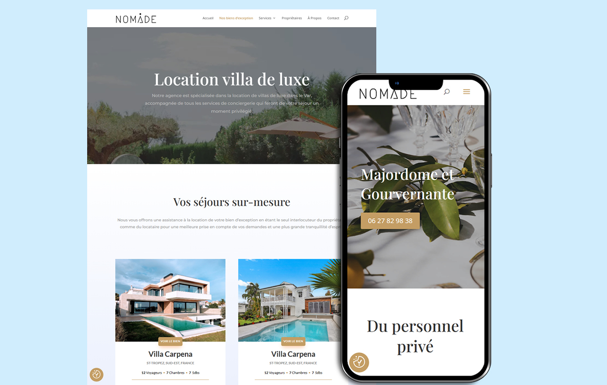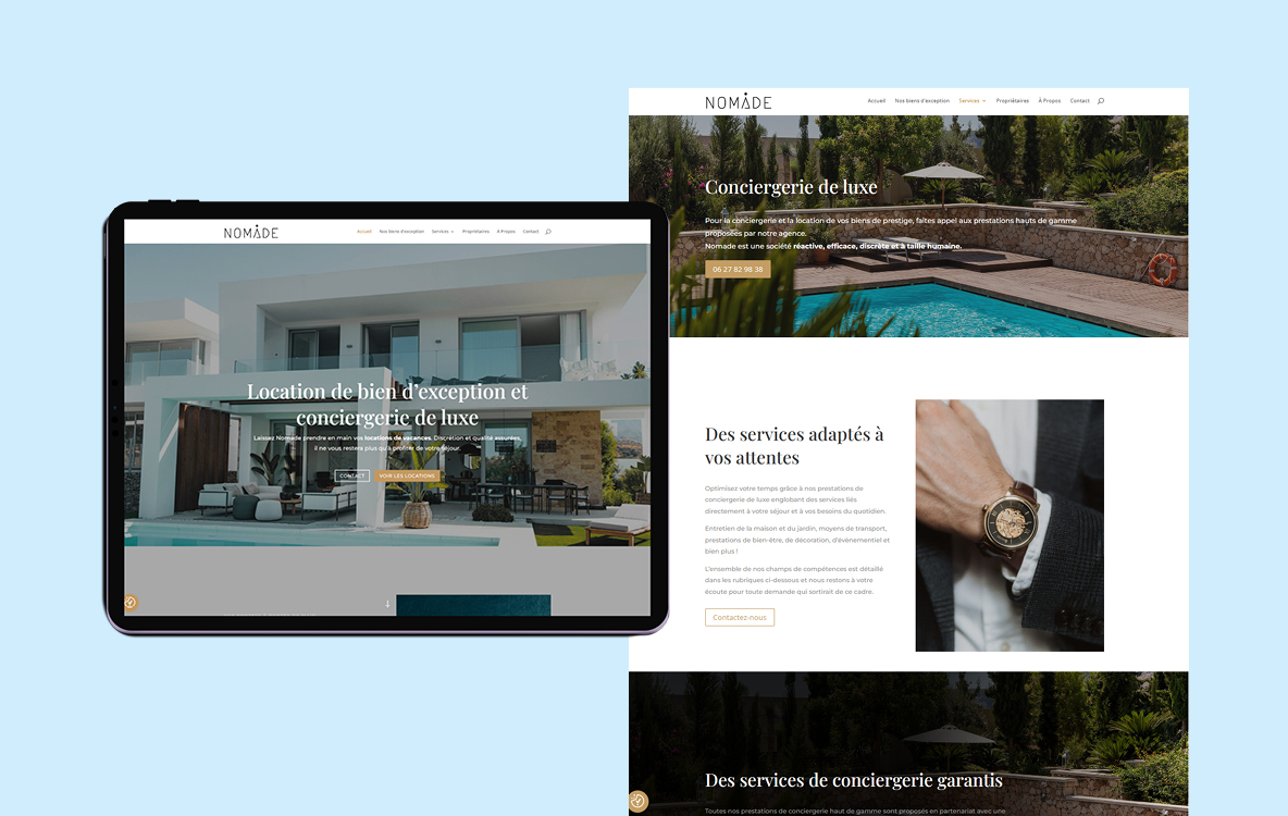 Plongez dans l’univers du luxe et de l’exclusivité grâce à notre projet : un site web réalisé pour NOMADE, entreprise de location de biens d’exception. Avec une typographie épurée et des couleurs raffinées comme le marron, le noir et le blanc, cette conception reflète parfaitement le monde du luxe et de l’élégance.