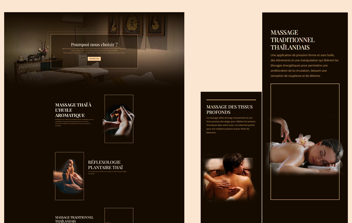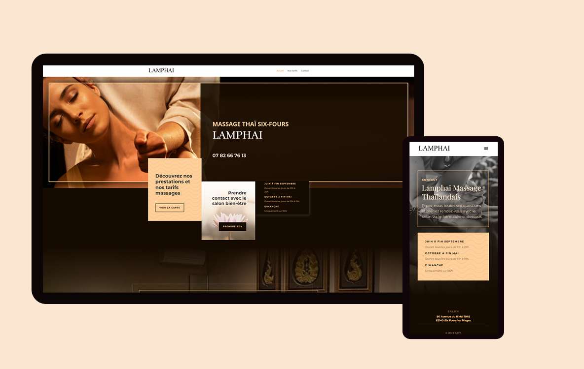 Explorez les différentes offres de massages et plongez dans une atmosphère de pure relaxation. Notre conception web a pour objectif de refléter la philosophie de LAMPHAI : l’harmonie, la détente, et le bien-être.