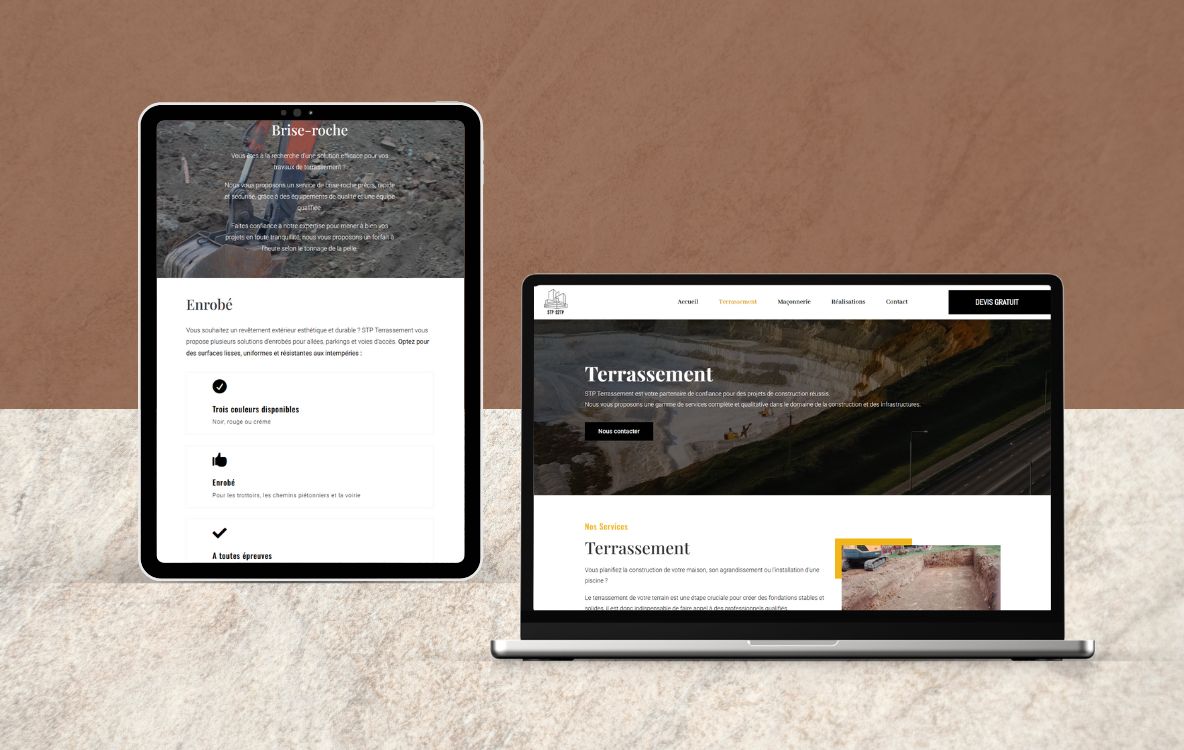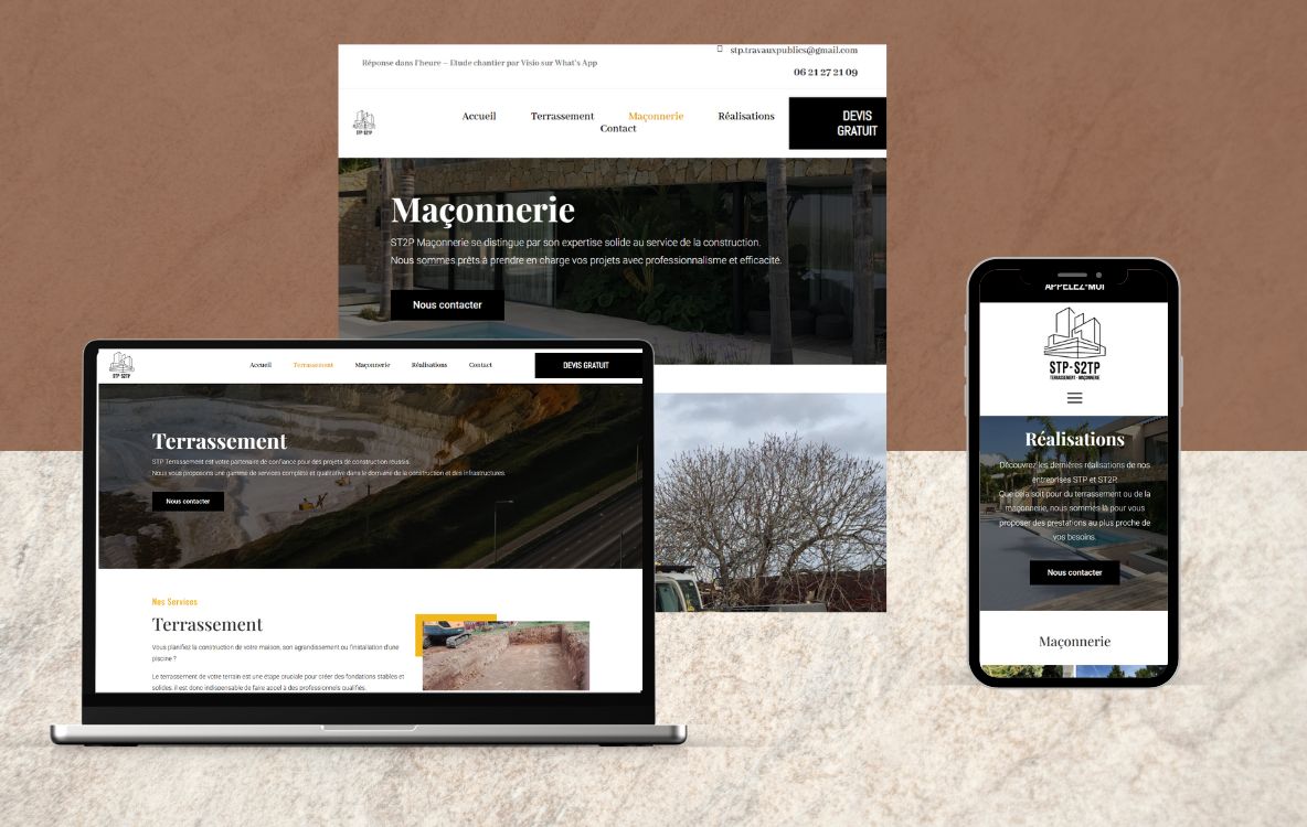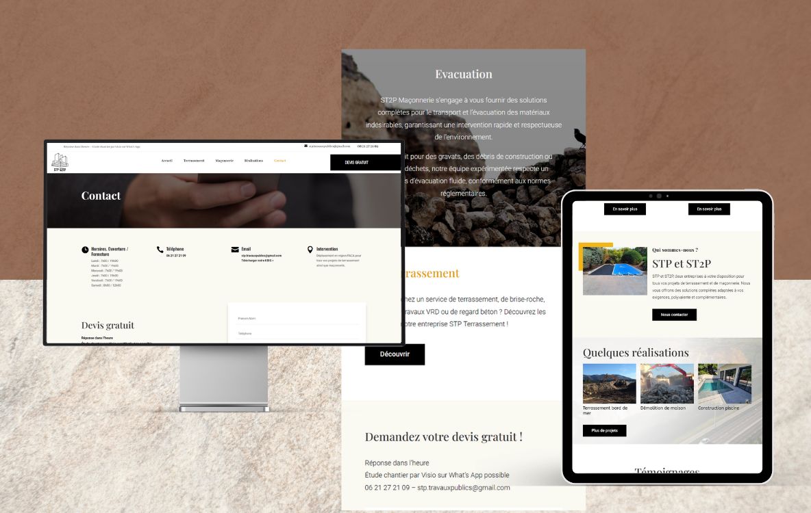 Le site web offre une interface moderne et conviviale, mettant en valeur l’activité de STP-ST2P dans le domaine de la maçonnerie et du terrassement dans le Var. Les visiteurs peuvent naviguer facilement à travers les pages pour découvrir les services complets offerts par l’entreprise, allant du terrassement de précision à la construction de structures solides sur tout le Var.