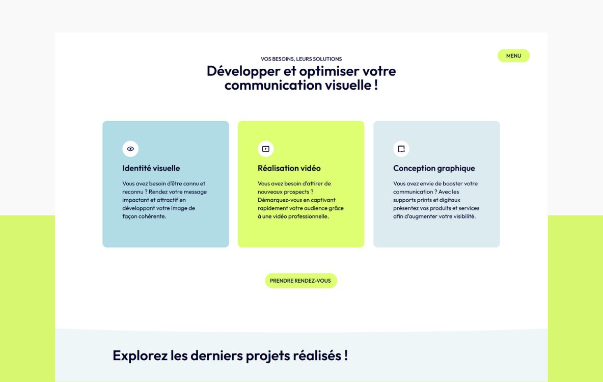 Notre travail consiste à améliorer son positionnement sur les moteurs de recherche en optimisant le contenu et les balises stratégiques. Nous mettons en avant ses services, tels que l’identité visuelle, la réalisation vidéo et la conception graphique, afin de capter une audience qualifiée et de maximiser son attractivité.