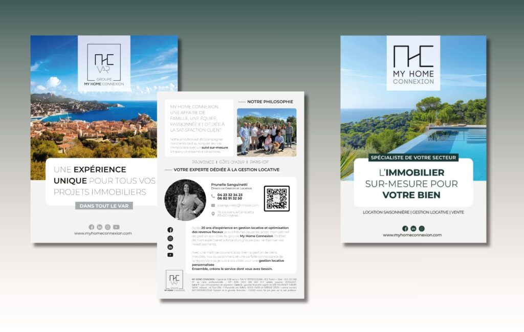 Nous avons accompagné My Home Connexion dans la conception d’une stratégie print globale, pensée pour renforcer leur image, leur visibilité et la cohérence de leur communication sur l’ensemble de leurs supports.